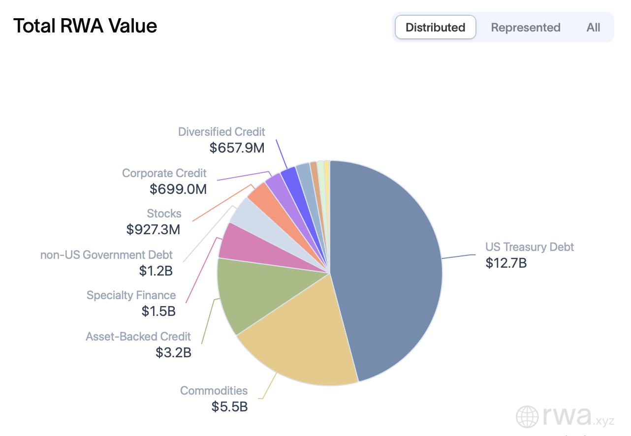 - Deuda del Tesoro estadounidense: $12.700 millones on-chain, casi la mitad del mercado RWA total. BlackRock BUIDL controla más del 40% de este segmento.