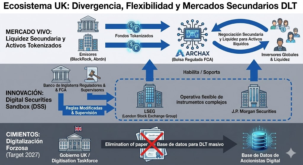 DIVERGENCIA ESTRATÉGICA (UK vs UE): Se consolida una especialización dual: Europa Continental (Francia/Alemania) prioriza la estandarización y seguridad jurídica, mientras el Reino Unido lidera la flexibilidad y la liquidez secundaria a través de su Digital Securities Sandbox.