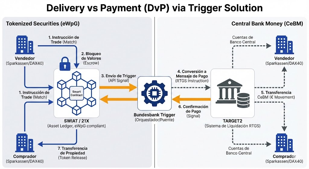 La infraestructura alemana se distingue por resolver el problema crítico de la "pata de efectivo" (cash leg) en la liquidación. Mediante la "Trigger Solution" del Bundesbank, el mercado alemán conecta redes DLT privadas como SWIAT con el sistema de liquidación TARGET2 del Eurosistema.